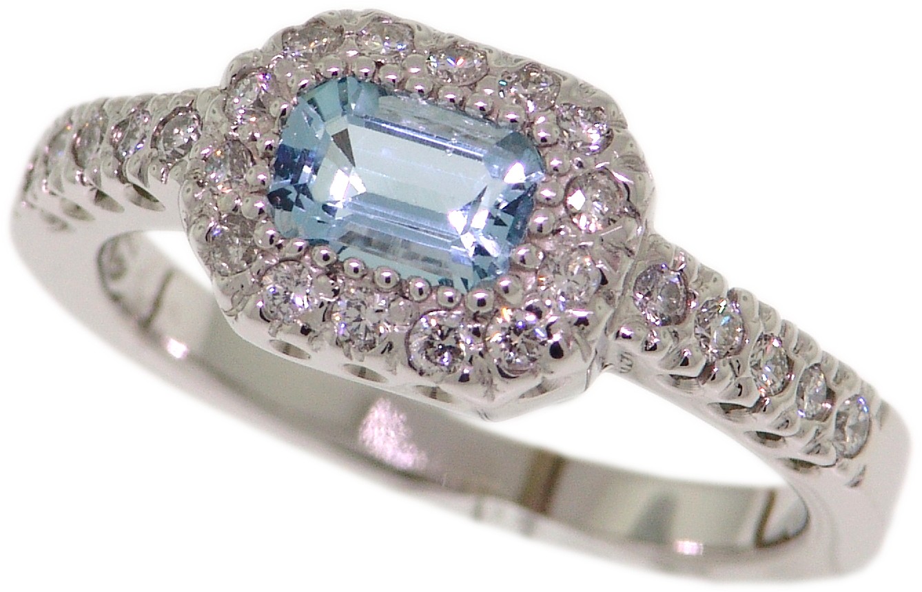 | Style # 5002 Ladies 6x4 E.C. Aquamarine 24=.36TW 14k Ring Available in yellow or white gold. |