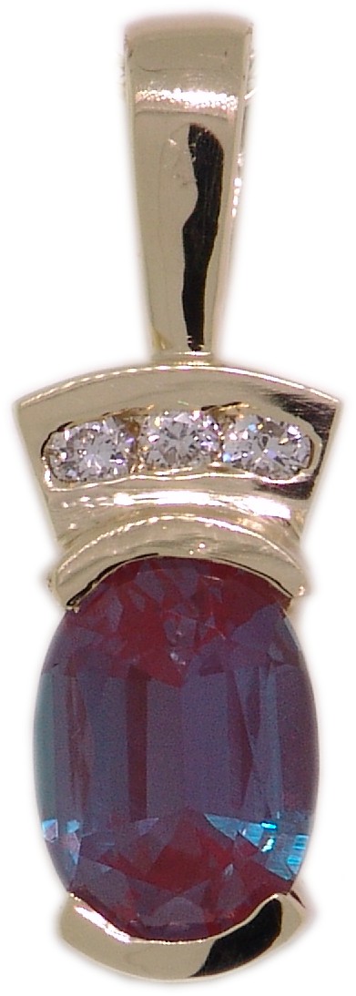 | Style # 4184 Ladies 7x5 Oval Cr. Alexandrite 3=.05TW 14k Pendant Available in yellow or white gold. |
