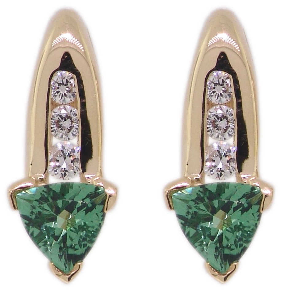 | Style # 3824 Ladies 5x5 Trill Green Tourmaline 6=.15TW 14k Earrings Available in yellow or white gold. |