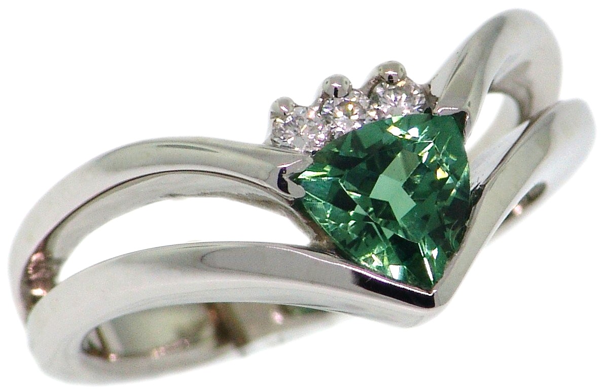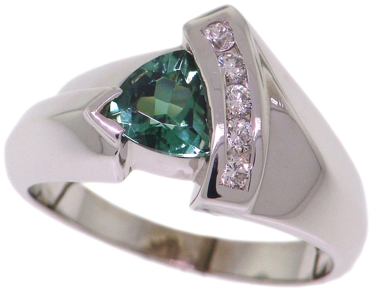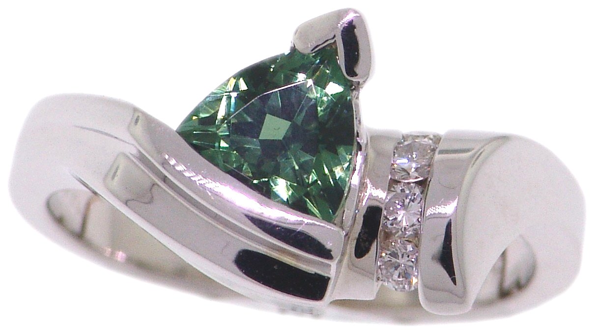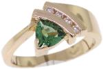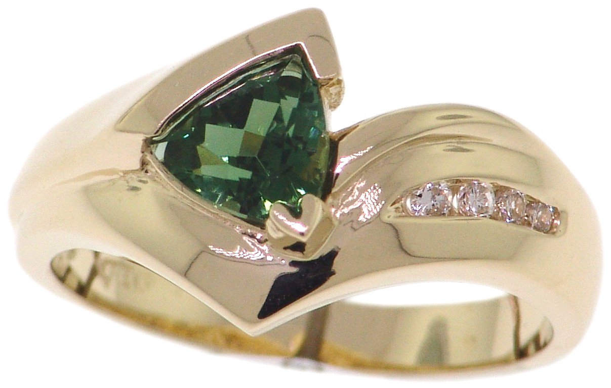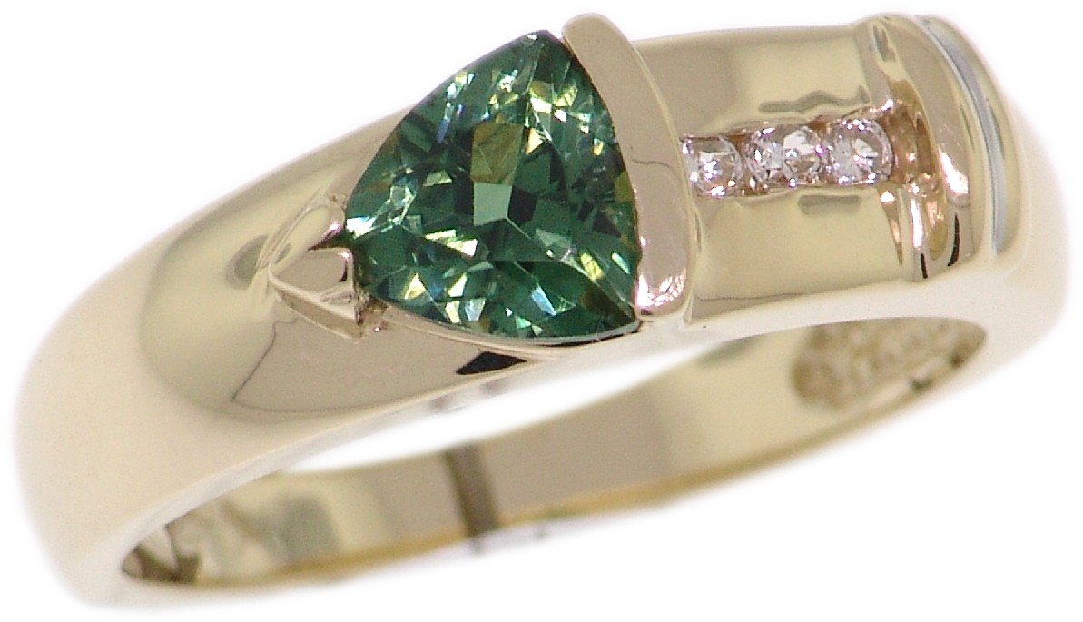 | Style # 4556 Ladies 6x6 Trill Green Tourmaline 3=.045TW 14k Ring Available in yellow or white gold. |