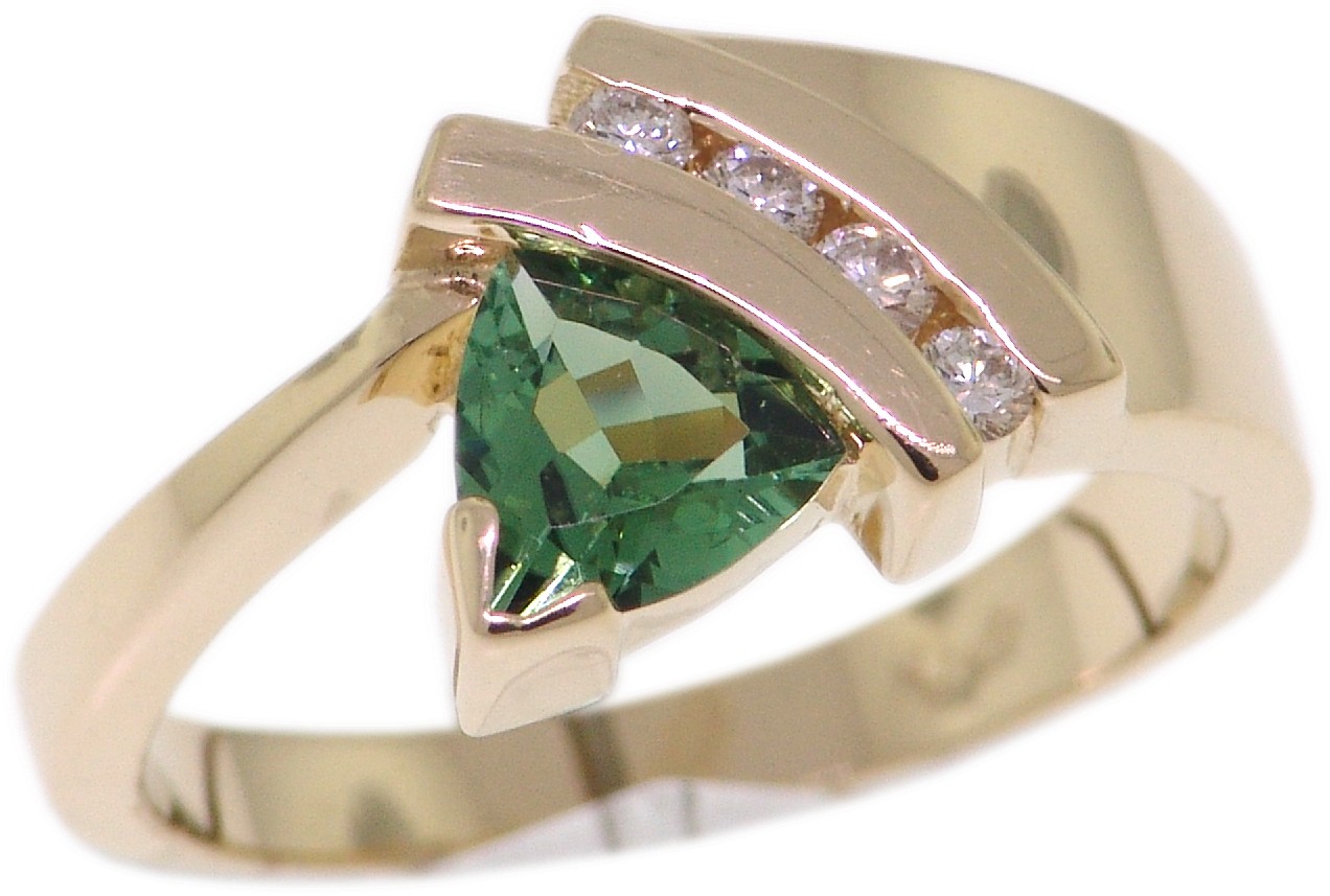 | Style # 3954 Ladies 6x6 Trill Green Tourmaline 4=.12TW 14k Ring Available in yellow or white gold. |