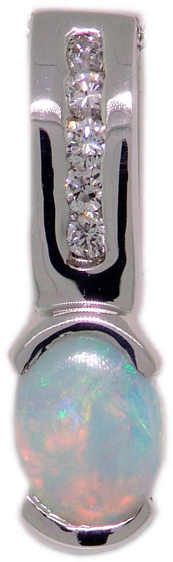 | Style # 4429 Ladies 7x5 Oval Opal 5=.075TW 14k Pendant Available in yellow or white gold. |