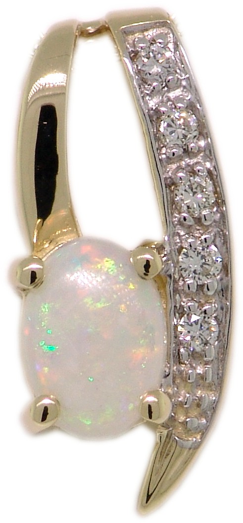 | Style # 4844 Ladies 7x5 Oval Opal 5=.05TW 14k Pendant Available in yellow or white gold. |