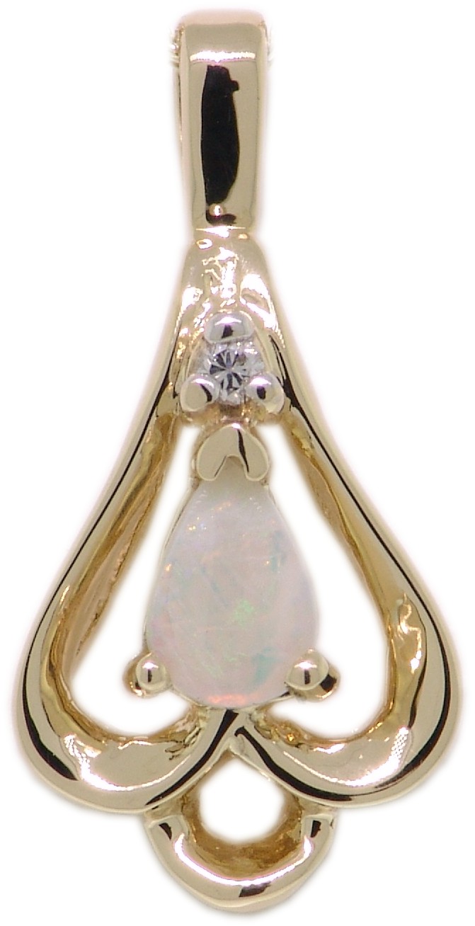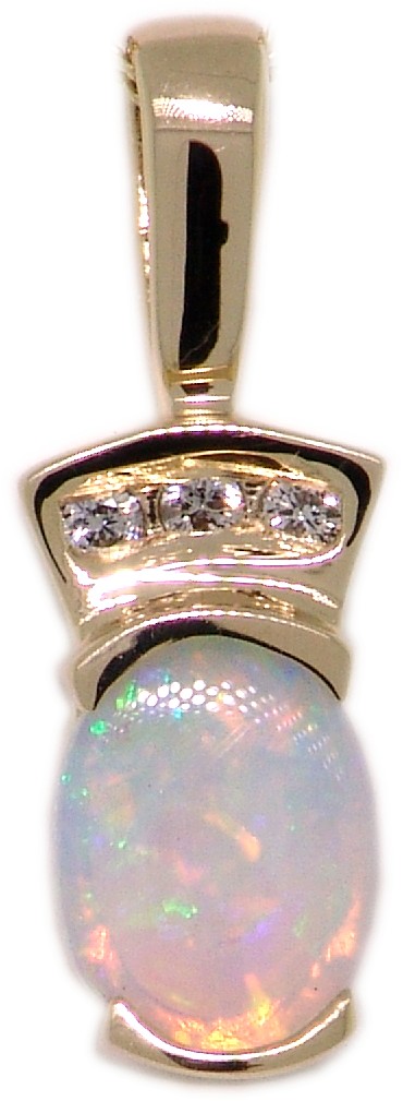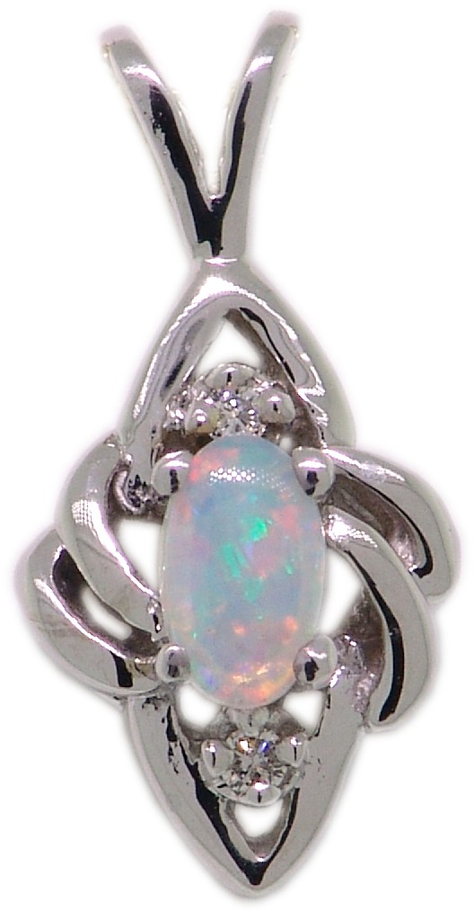 | Style # 4184 Ladies 7x5 Oval Opal 3=.05TW 14k Pendant Available in yellow or white gold. |