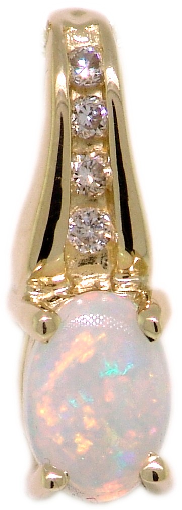 | Style # 4140 Ladies 7x5 Oval Opal 4=.05TW 14k Pendant Available in yellow or white gold. |